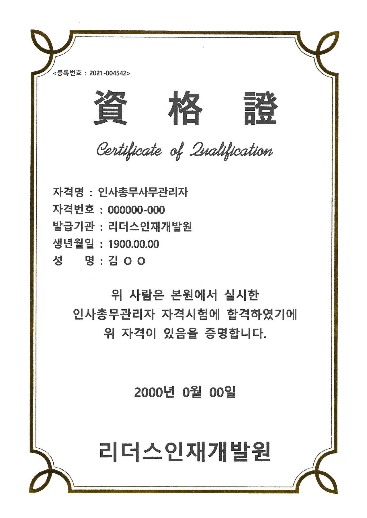 자격명 | 인사총무사무관리자 (Human Resources Manager) |